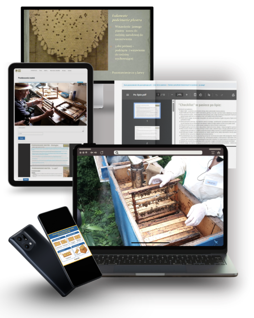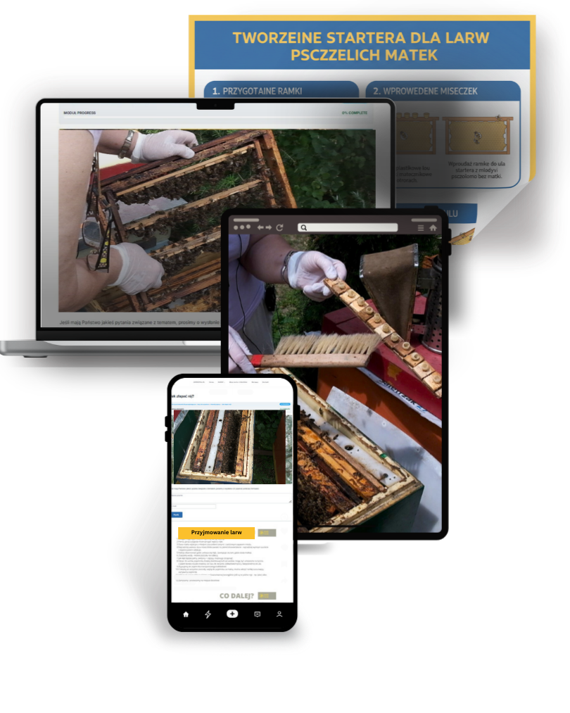 Postanowiliśmy wykorzystać nasze doświadczenie w tworzeniu treści edukacyjnych online i zaprosić Panią Łucję do współtworzenia kursu i merytorycznej opieki. Nagraliśmy materiały w pasiece SAWA, połączyliśmy w jeden system oparty na autorskiej metodzie edukacji, aby jak najwięcej osób mogło skorzystać, poprawić wyniki w swoich pasiekach i cieszyć się efektami!